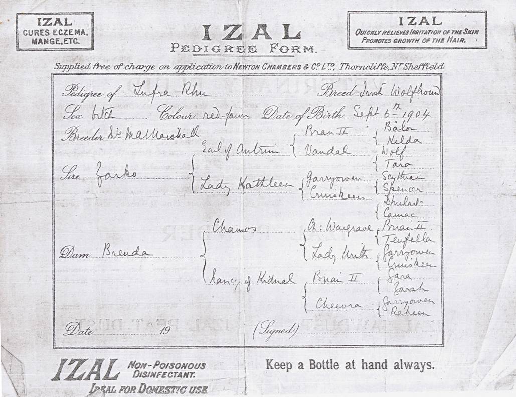 Pedigree LUFRA RHU (second copy) born 6.9.1904
