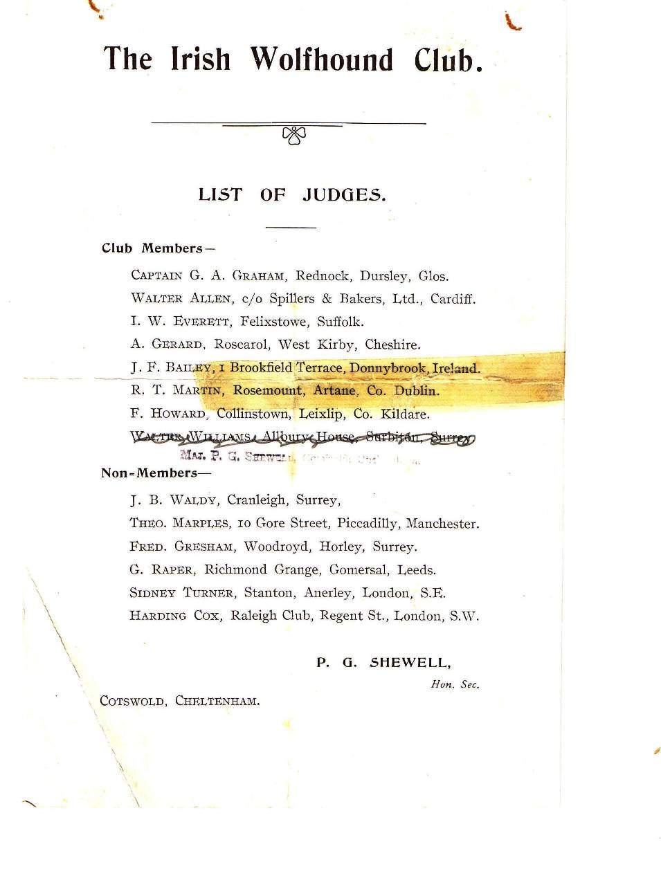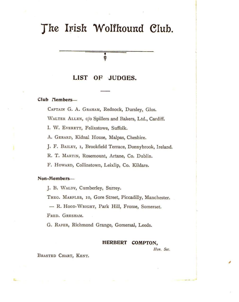 Irish Wolfhound Club Early Judges Lists Not dated. Pre the death of Capt Graham in 1909