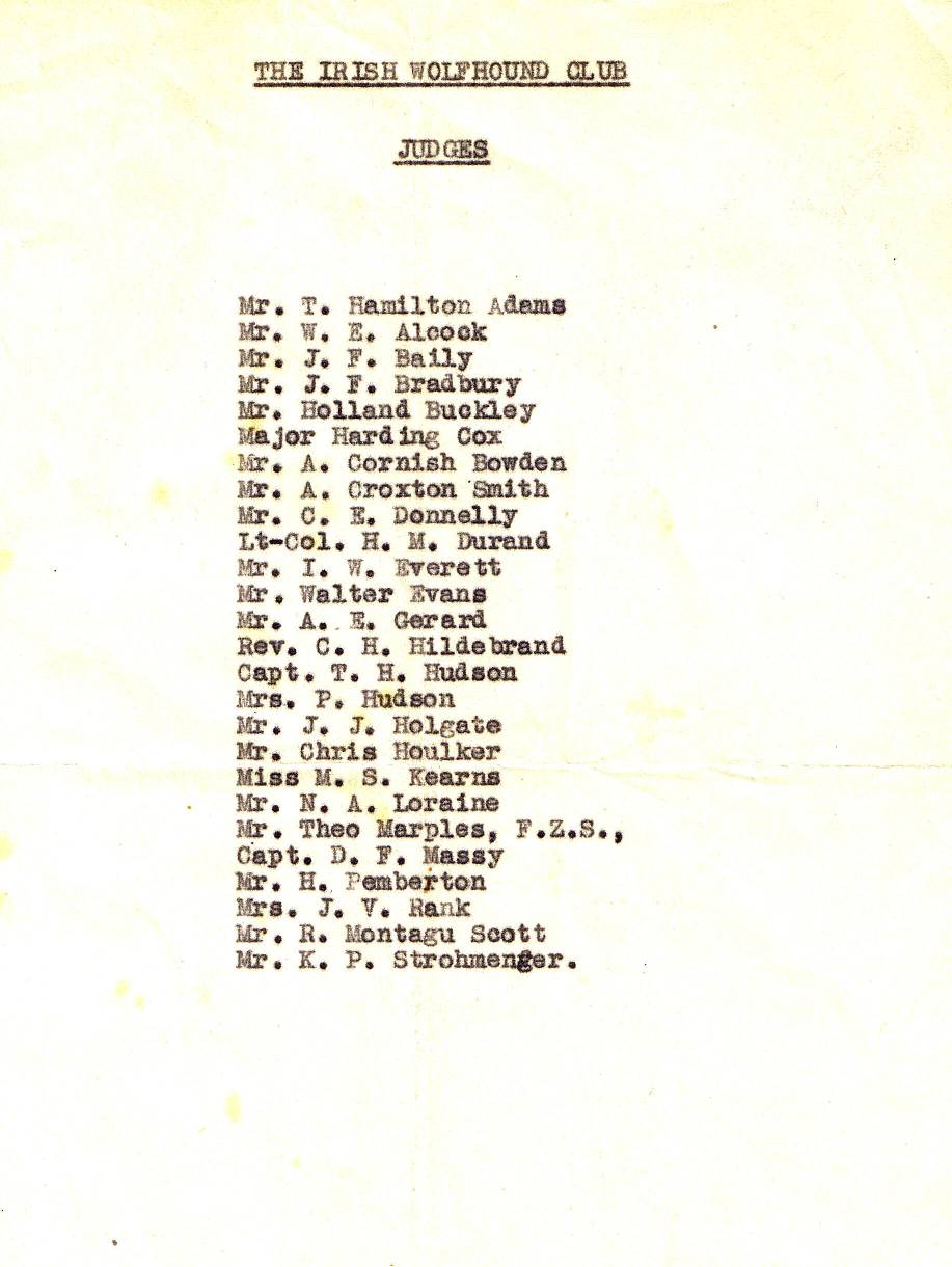Irish Wolfhound Club Later Judges List Not dated. Perhaps 1920s